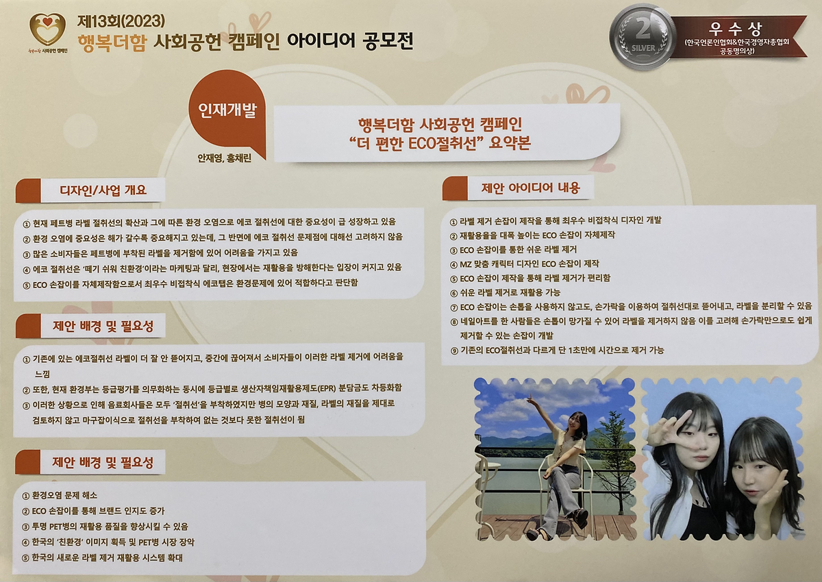 2023년 2월 24일 한국언론인협회, 한국경영자 총 협회가 공동 주최한 2023 제13회 행복더함 사회공헌 공모전(02.24, 조선호텔)에서 한림대 미래융합스쿨 융합관광경영학과 안재영이 “더 편한 ECO 손잡이”로 한국언론인협회&한국경영자총협회 공동명의상 (우수상, 상금 50만원)을 수상했음을 알려드립니다.