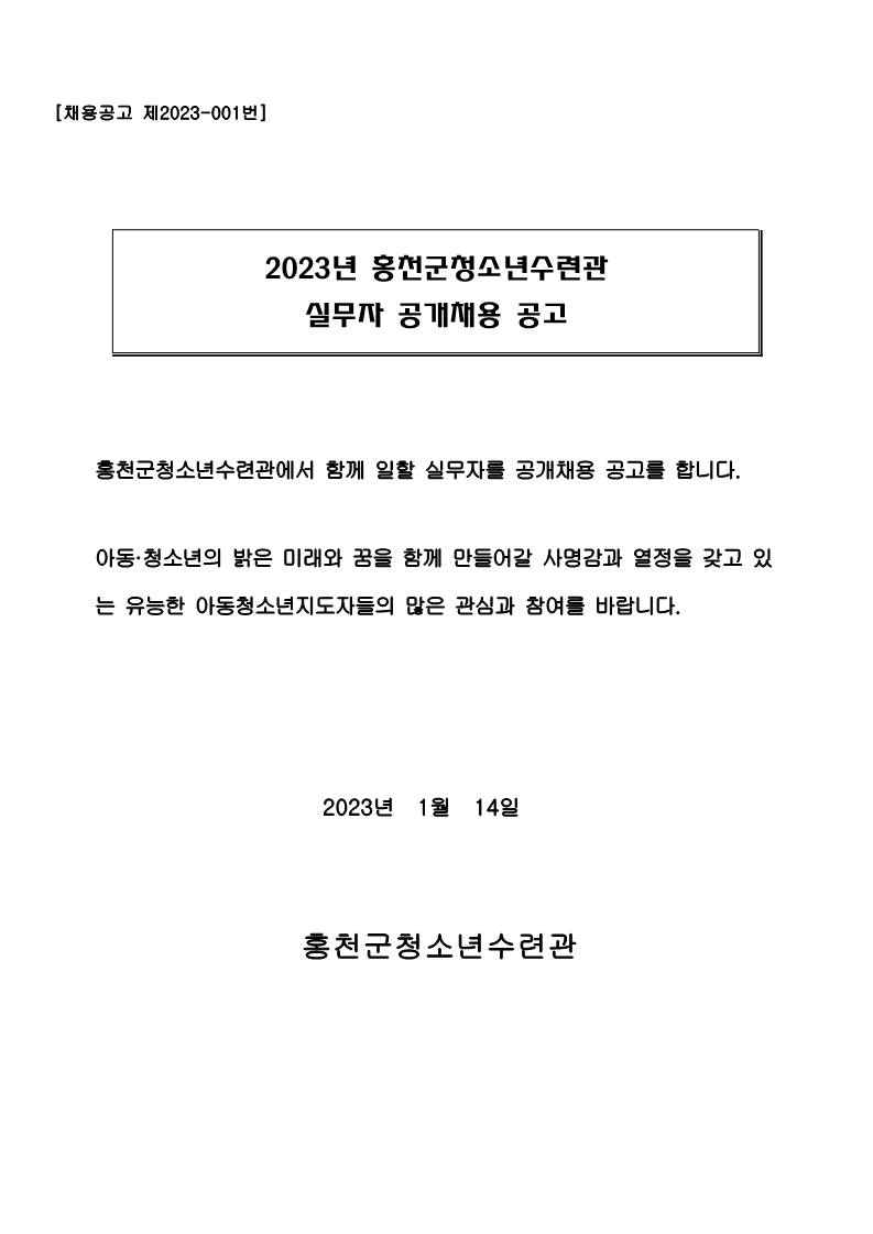 2023년 홍천군청소년수련관 실무자 공개채용 공고