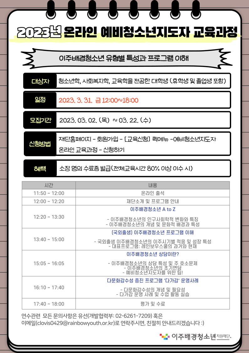 [이주배경청소년지원재단] 예비청소년지도자 온라인 교육과정(3.31) 교육생 모집 안내