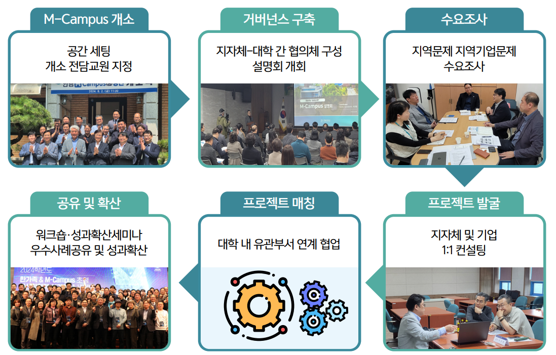 - M-Campus 전담교원 지정, 공유협업협의체 9개 구성, 지역문제-지역기업 수요조사 및 교내 협업